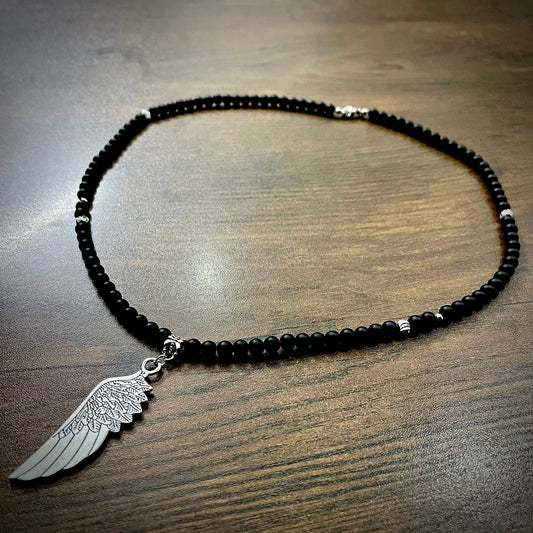 Minimal Silver Feather & Black Beads Pendant Necklace For Men
