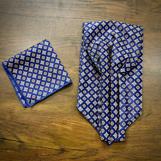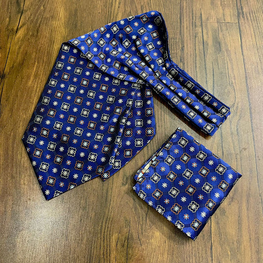 Blue Pattern Jacquard Woven Cravat Tie and Pocket Square Set